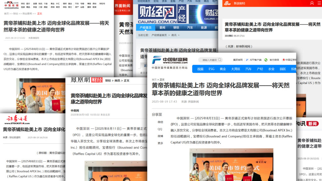 2025年8月19日,中国茶饮行业迎来里程碑时刻——黄帝茶铺与莱佛士资本、宝德证券的赴美上市签约仪式获八大全球财经媒体同步报道!包括中金在线、财经网、和讯新闻、界面新闻、凤凰财经、中国财富网、新浪财经、证券之星在内的权威平台,共同聚焦这一中国茶饮品牌全球化进程的关键一步。